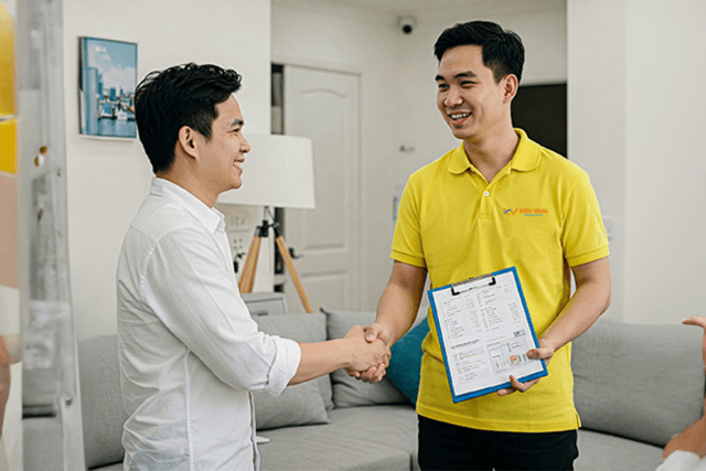 Khách hàng cùng nhân viên kiểm tra lại toàn bộ đồ đạc và tài sản. Nếu không có gì vướng mắc thì khách hàng sẽ tiến hành thanh toán chi phí và thanh lý hợp đồng.
