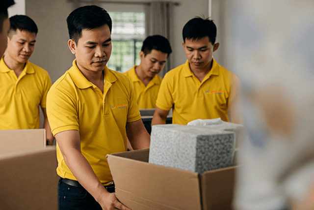 Đội ngũ nhân viên đến địa điểm đã hẹn đúng giờ, phân loại, đóng gói, bọc lót toàn bộ đồ đạc bằng vật tư chuyên dụng, đảm bảo an toàn tuyệt đối trong quá trình vận chuyển.
